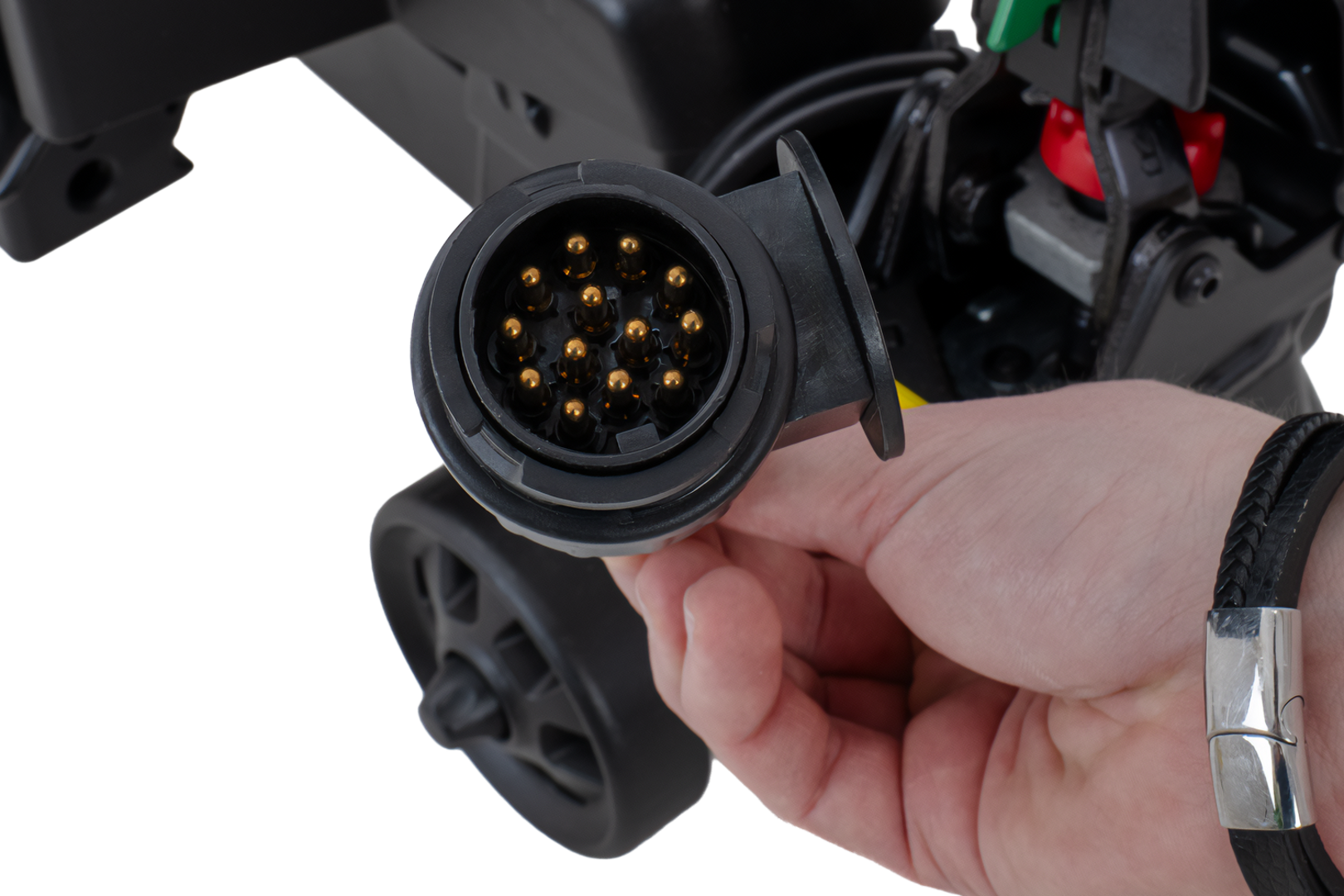 Dla pełnego bezpieczeństwa platforma posiada 13-pinową wiązkę elektryczną obejmującą wszystkie wymagane światła: pozycyjne, stop, kierunkowskazy, przeciwmgielne, cofania oraz oświetlenie tablicy rejestracyjnej. Dzięki temu spełnia aktualne europejskie normy bezpieczeństwa.